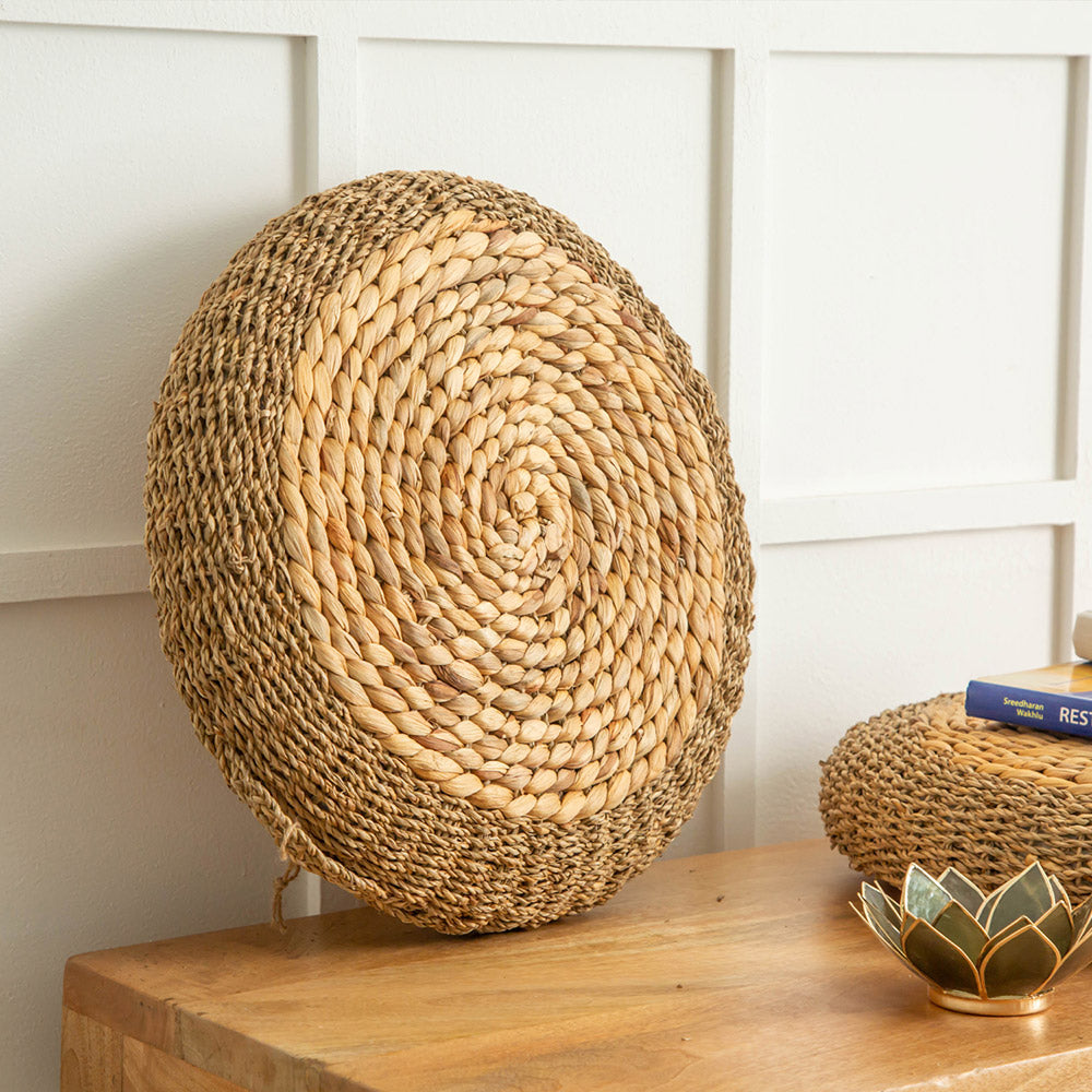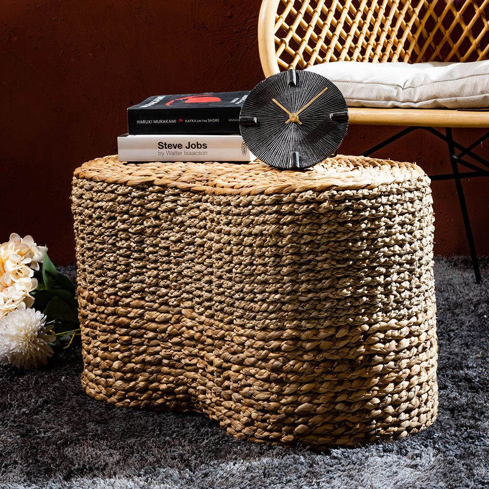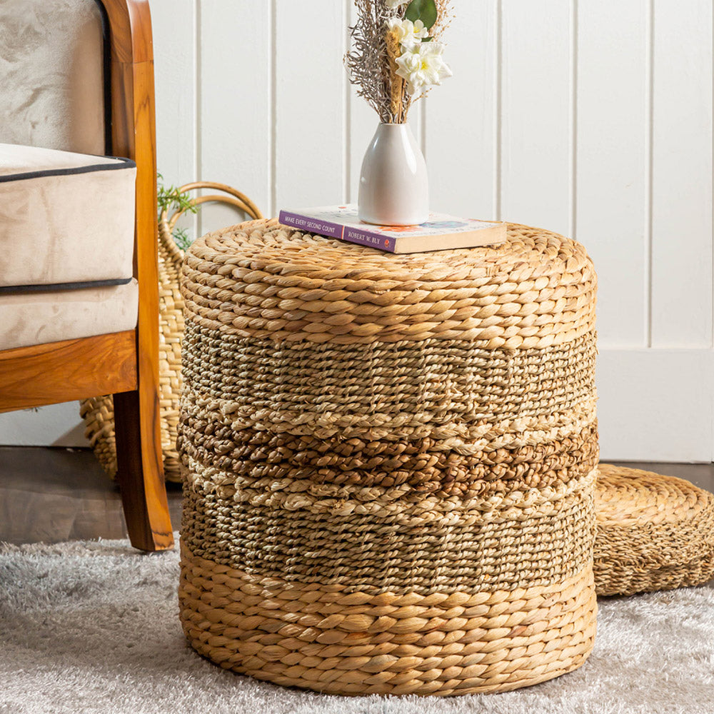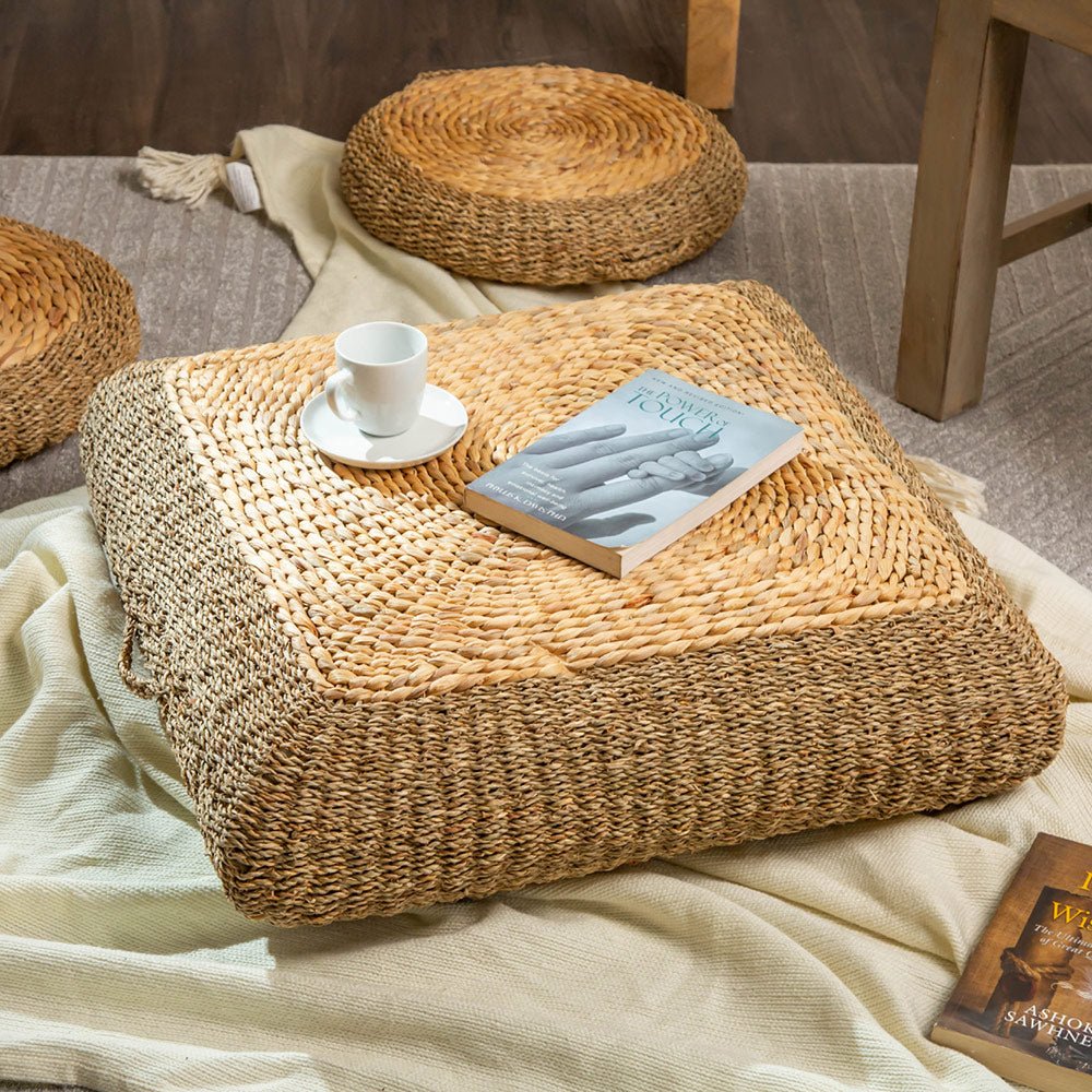 Our poufs are thoughtfully designed using a variety of premium materials such as cotton fabric, plywood, wooden bases, and handwoven natural fibres like water hyacinth and seagrass. The fillings ensure comfort and shape retention, making them both functional and decorative.