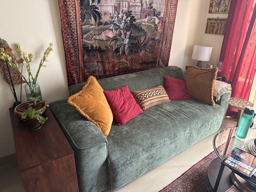This plush fabric sofa offers luxurious comfort and timeless style, inviting relaxation and conversation in any living space.